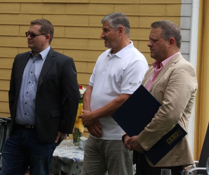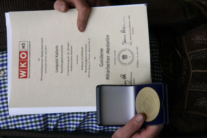 Seitens der Landesinnung der Rauchfangkehrer NÖ gratulierten KommR LIM Peter Engelbrechtsmüller, Bezirksinnungsmeister Stefan Schinnerl und Geschäftsführer Mag. Hannes Atzinger Herrn Andreas Schöllbauer für seine langjährige Tätigkeit als Arbeitgeber im Rauchfangkehrerhandwerk.